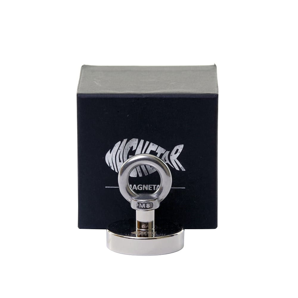 Are you looking for a small fishing magnet for you child? or did you drop something in the water which you need back? The Classic 110 fishing magnet is the way to go! This magnet is a small size for children, but powerful as well. 240 lb / 110kg sounds like a lot of pull, but the full pull will only be reached in perfect conditions. These conditions are: flat metal with a thickness of 2 cm, no rust and no mess between the magnet and the metal. You can pull 110kg straight up in these conditions.