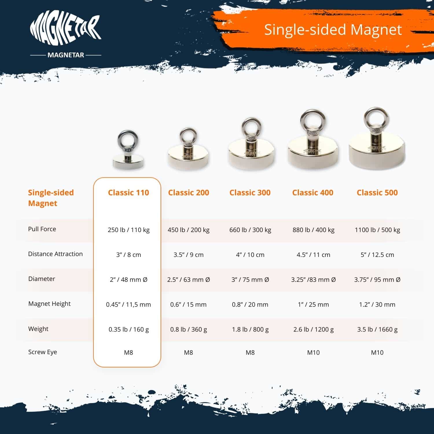 Classic Fishing Magnet 240 lb / 110 kg är ett relativt prisvärt alternativ för att börja med magnetfiske. Den ensidiga magneten har dragkraft enbart från undersidan. Eftersom all magnetisk kraft koncentreras i en riktning kan denna magnet vara ganska kraftfull under rätt förhållanden.